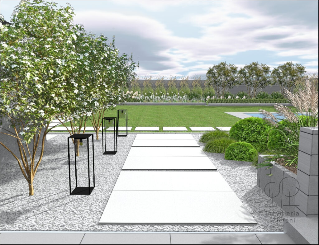 Nowoczesny ogród o czystej i przejrzystej formie zachwyca jasną tonacją nawierzchni i spójnym układem przestrzeni. Dominują białe kwiaty i zimozielona roślinność, które podkreślają elegancję oraz harmonię kompozycji. W projekcie przewidziano także miejsce na basen i strefę zabaw dla dzieci, co czyni ogród funkcjonalnym i przyjaznym dla całej rodziny.